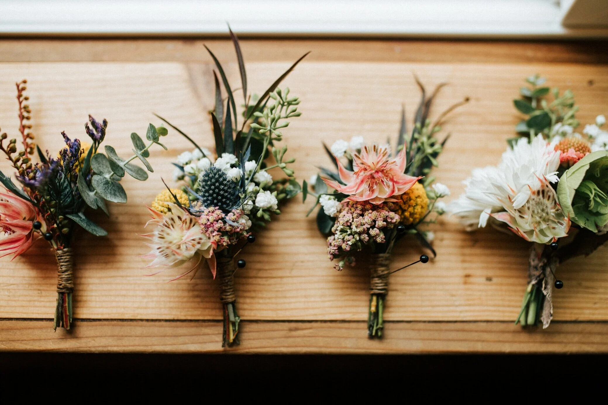 This package features two boutonnières. Each personal boutonnière contains one focal flower, a bit of filler and foliage all utilizing the seasons best offerings.